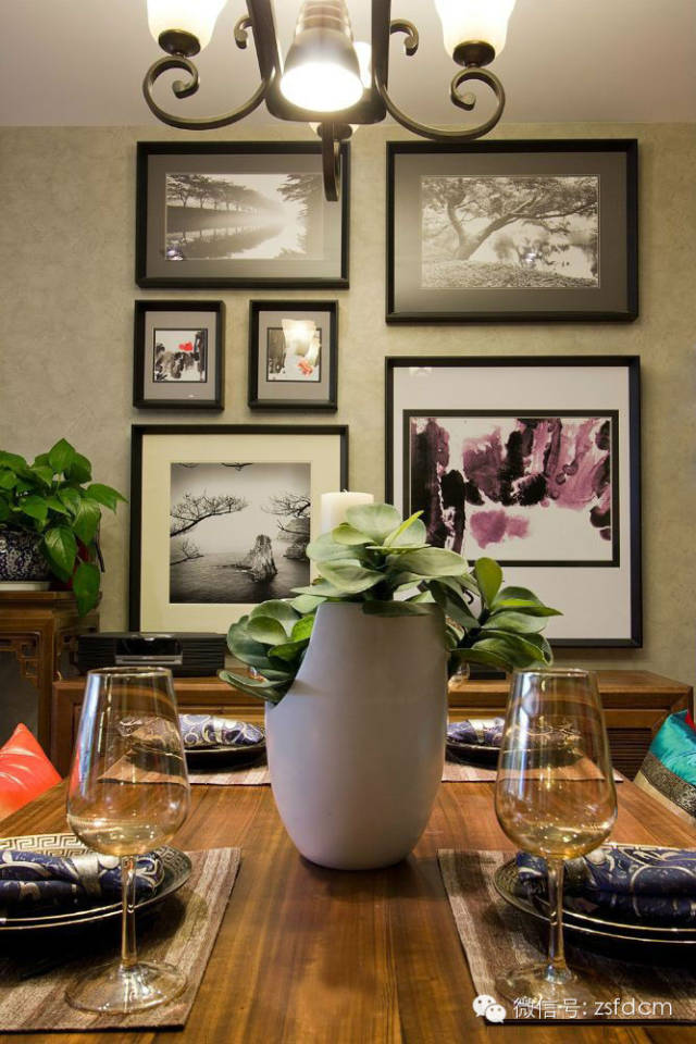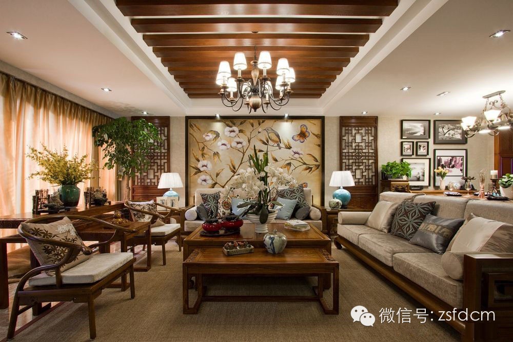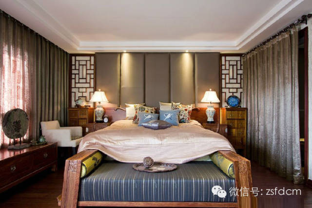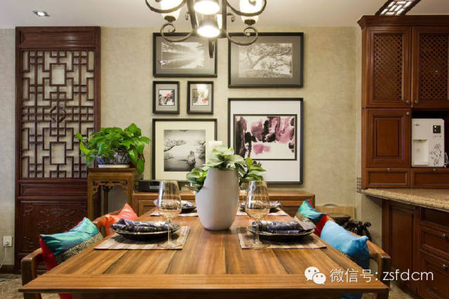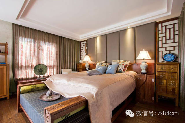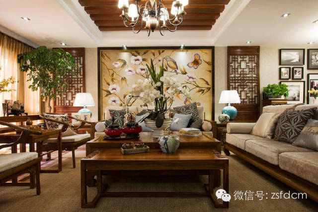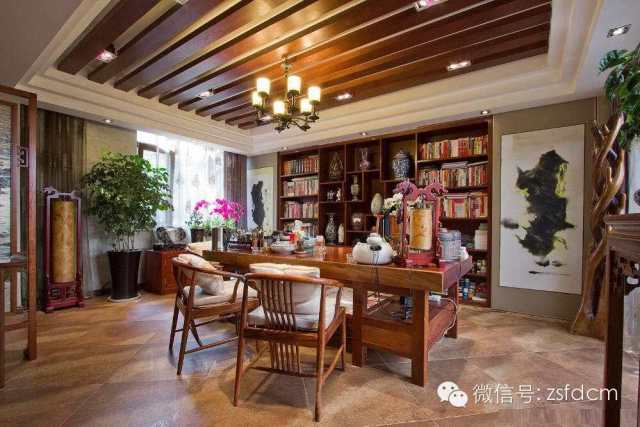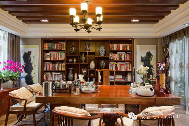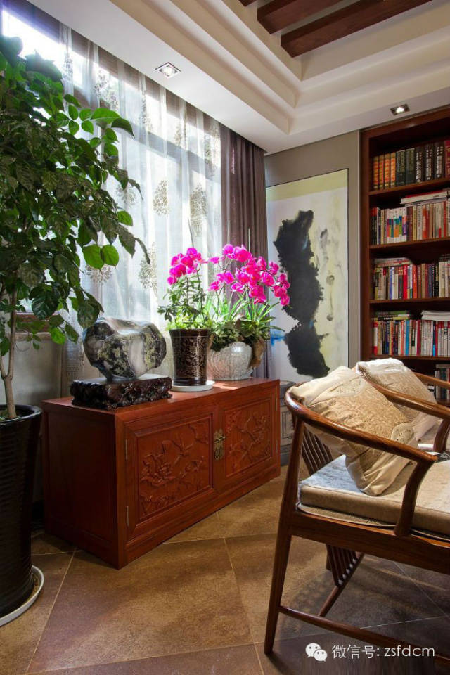 古色古香的中式庭院,摆放规矩却姿态各异的绿植,让人眼前一亮,展示了主人热情又含蓄的接待;客厅简洁的雕花,朴素的家具,自然气息浓郁的沙发背景,仿若有淡淡的梅香,悦耳的鸟语,那抹宁静的蓝,宜人的绿,优雅高贵的蝴蝶兰......无一不彰显着主人低调随和,优雅高贵,从容大气的性格特点;规矩的木方吊顶,抽象写意的山水画,摆放得一丝不苟的书籍,木质的中式家具,具有中式韵味的配饰,同样以绿植作为点缀的书房,给人以严谨庄重,文化气息浓厚的感觉;柔软的软包配以线条硬朗简洁的雕花,再搭配富有自然气息的抱枕,传统的中式家具,